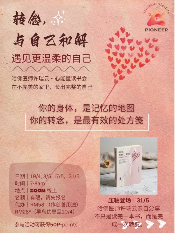 为了让本次读书会更加丰富而有深度,我们特别邀约了《转念,和自己和解》的作者——许瑞云,于最后一场(31/5)亲临分享,与大家温柔相伴、一同走进转念的力量。